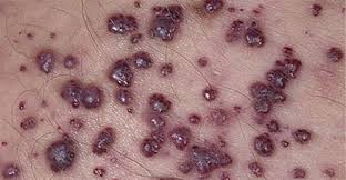 Кроме того, появляются боли в руках и ногах, отмечаются лихорадочные состояния, пурпурные кожные высыпания. Последние являются характерным признаком заболевания. Пятна диаметром в несколько миллиметров могут отличаться цветом — от красного до синего. Они также могут быть как плоскими, так и слегка выступающими над кожей. Основные места их локализации — ягодицы, бедра, пах, область пупка, пальцы рук, колени, локти.